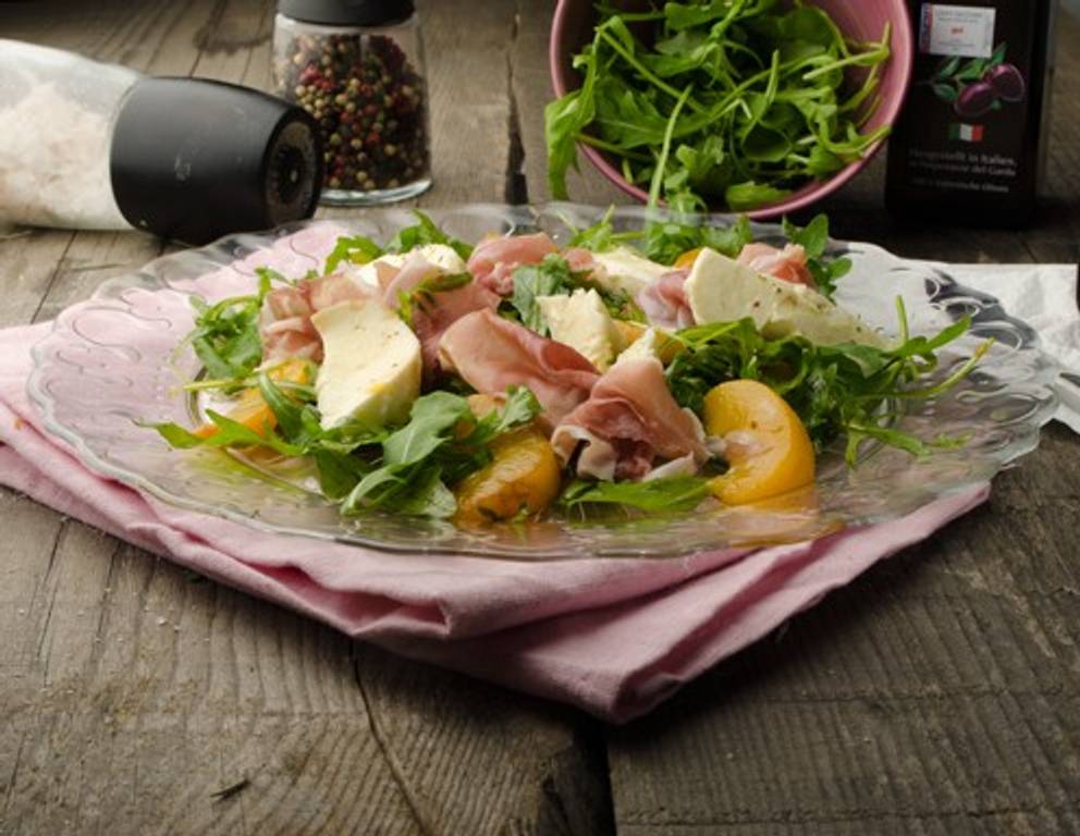 - Den Rucola auf einem Teller anrichten, mit den Mozzarella, Prosciutto und Pfirsichen belegen und das Dressing über dem italienischen Pfirsichsalat verteilen.