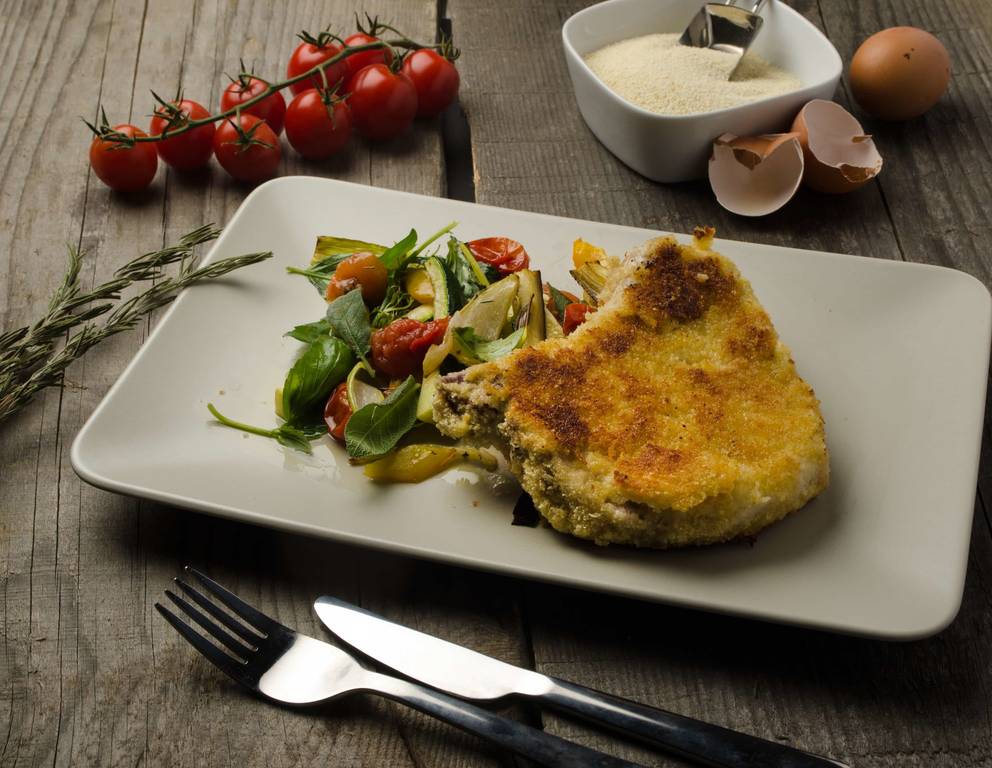 Zu den Parmesankoteletts mit dem Ofengemüse passt auch frischer Salat.