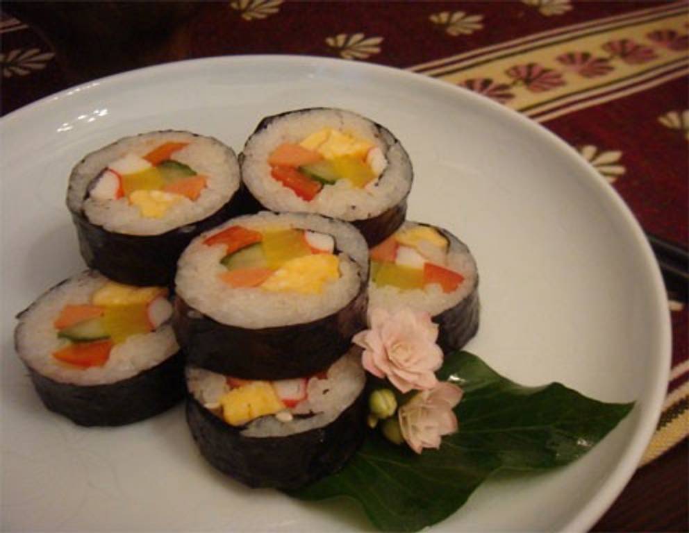 - Legen Sie die Füllung auf den Reis und rollen Sie das Seealgenblatt mit Hilfe des Bambusrollers vorsichtig auf. Man sollte nicht auf einmal, sonder schrittweise, eng rollen, sodass der Reis und das Seealgenblatt gut aneinander kleben bleiben. Bereiten Sie so alle fünf Rollen zu.