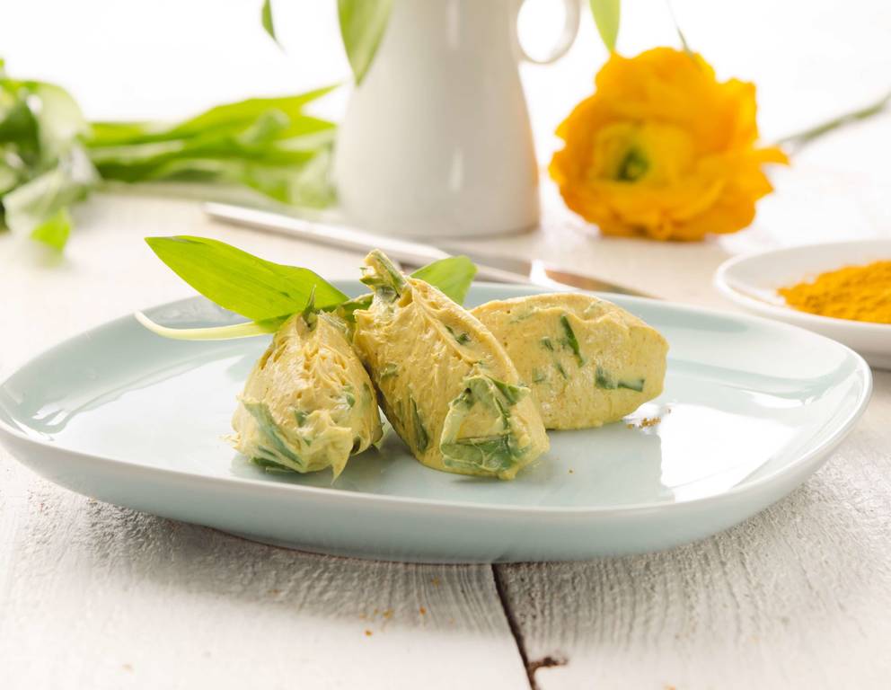 - Die Bärlauch-Curry-Butter entweder sofort verwenden oder in eine Spritztüte füllen, dekorative Rosetten auf ein Schneidbrett setzen und ins Gefrierfach geben. Sind die Rosetten gefroren, dann in eine Plastikbox umfüllen.