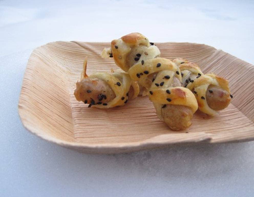 - Die Würstel damit von oben nach unten, diagonal aufwärts, umwickeln und so ein hübsches Gitter erzeugen.
