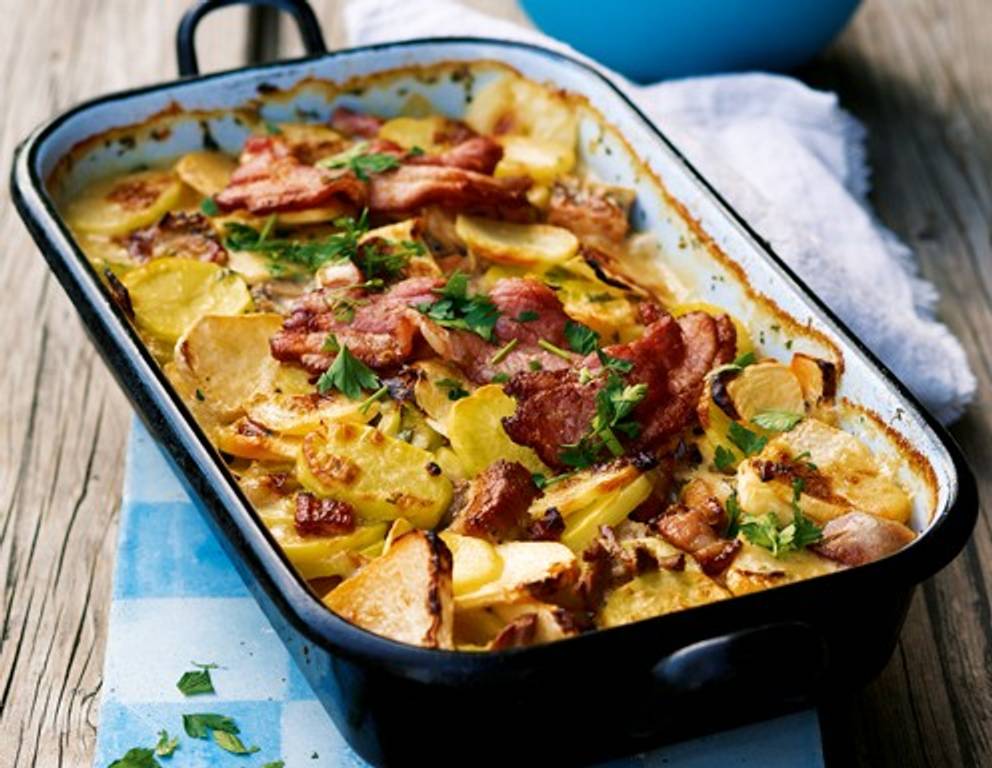 - Den Backofen auf 180°C vorheizen. Währenddessen die Kartoffel-Steckrüben-Mischung lagenweise in einen großen ofenfesten Topf oder Bräter (ideal: aus Gusseisen) schichten, dabei auf jede Lage einige Stücke Schweinebauch geben. Mit einer Kartoffel-Steckrüben-Schicht abschließen. Den Schlagobers und den restlichen Wein zum beiseitegestellten Kochsud geben und unter Rühren aufkochen. Mit Salz, Pfeffer und reichlich Muskatnuss würzen und über die Kartoffel-Steckrüben-Mischung gießen. Die beiseitegelegten Speckscheiben darauf verteilen.