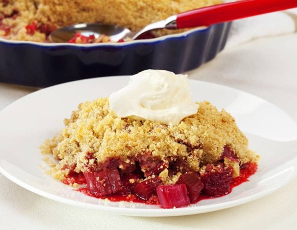 - Für den Crumble sämtliche Zutaten in eine Schüssel geben und mit den Händen bröselig durchmischen. Über den Rhabarber verteilen und den Rhabarber-Crumble im heißen Backrohr ca. 25 Minuten goldgelb backen.