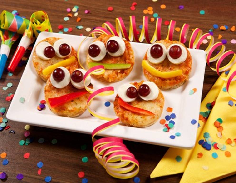 Anstelle der Trauben eignen sich auch Brombeeren, Himbeeren oder schwarze Oliven als Augen für die lustigen Pizzagesichter.