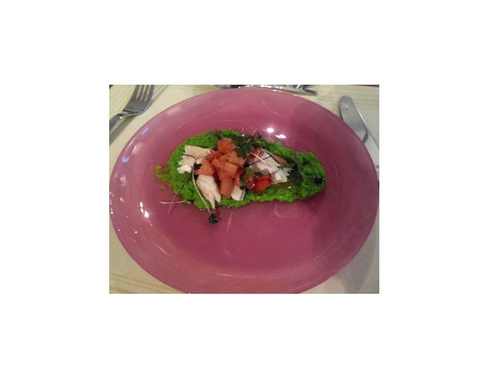 - Den Fisch aus den Kräutern heben und mit etwas Salz und Zitronensaft würzen. Den Fisch mit Chili-Rhabarber-Vanille Kompott und Erbsen-Püree servieren.