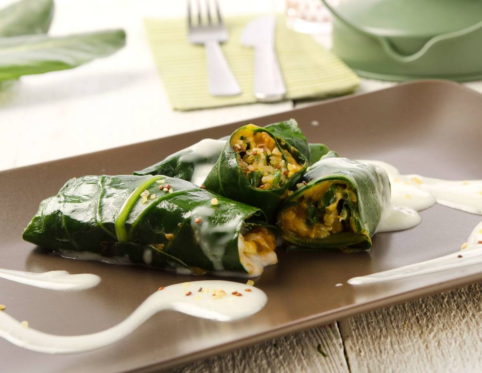 Wenn die Bulgur-Mangold-Röllchen nicht rein vegetarisch sein müssen, so können die Mangoldblätter vor dem Füllen mit je einer Scheibe Rohschinken belegt werden.