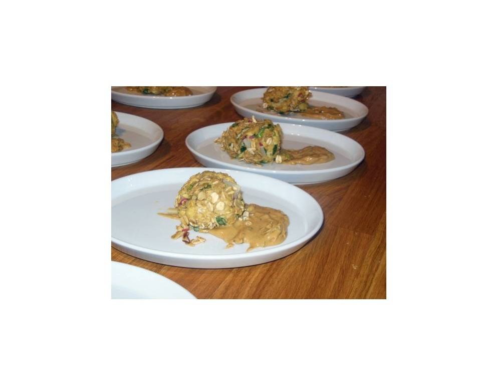- Die Tofulaibchen mit Müslikruste und Erdnussbutter-Kürbiskern Dip mit frischem Salat servieren.