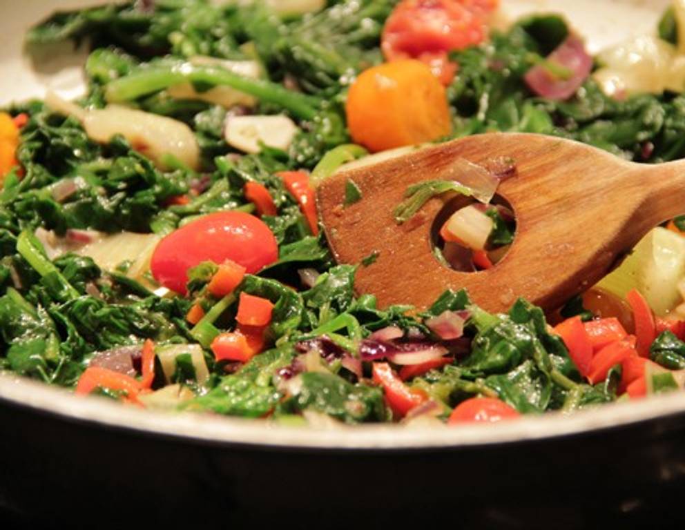 - Olivenöl erhitzen, Zwiebel ansautieren, Fenchel, Knoblauch, Paprika und Tomaten  beifügen und alles braten. Den frischen Spinat hinzugeben und zusammenfallen lassen. Pinienkerne in einer extra Pfanne ohne Fett rösten, bis sie duften und über die Schnelle Spinat-Gemüse-Pfanne streuen.