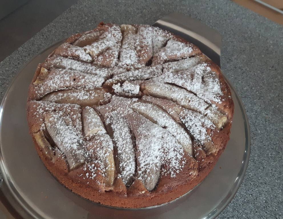 - Den fertigen Schoko-Bananen-Kuchen auskühlen lassen und mit Staubzucker bestreuen.