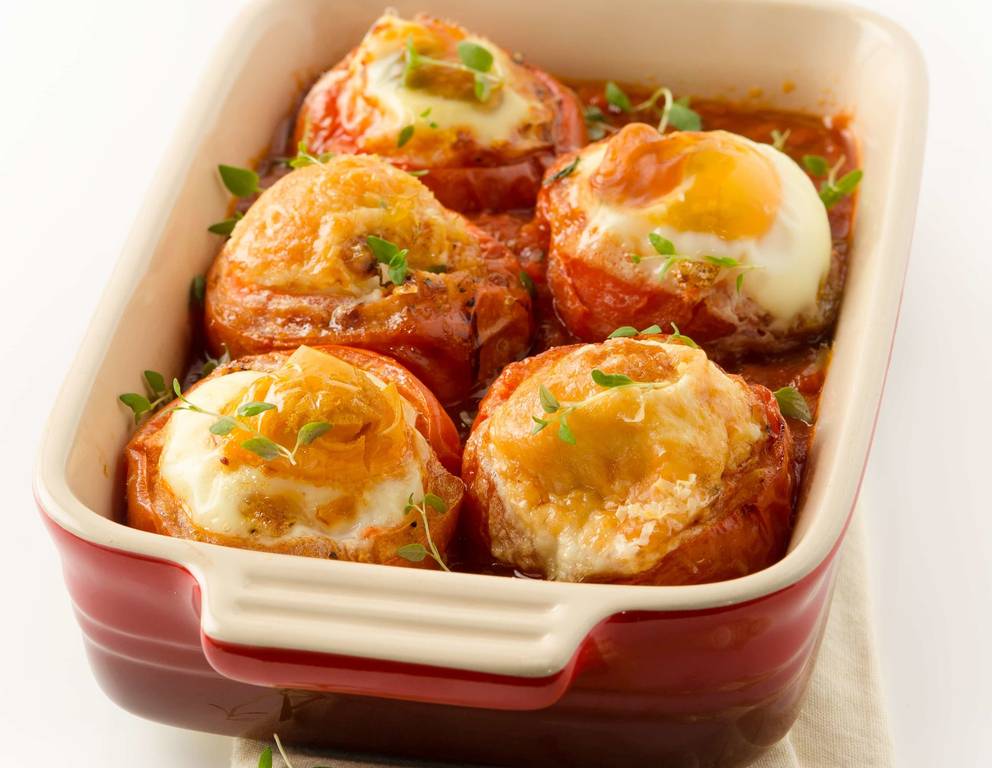 - Die ausgehöhlten Paradeiser in eine feuerfeste Form stellen und ebenfalls mit ein wenig Essig beträufeln. Die Schalotten-Paradeiser-Mischung in die Paradeiser füllen. Dann je Paradeiser ein Ei hineinlaufen lassen. Nur das Eiklar vorsichtig mit Salz würzen.