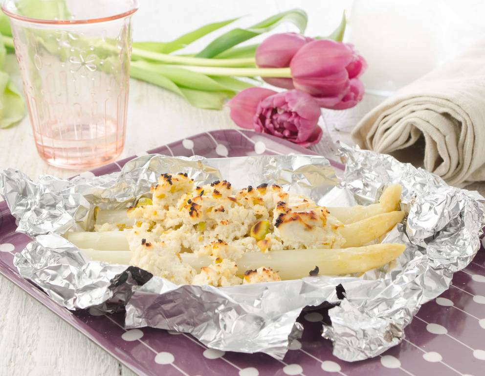 - 3 Stangen Spargel auf ein Stück Alufolie legen, etwas Traubenkernöl darüberträufeln, die Ricottamasse darauf verteilen, gut zu einem Paket verschließen und im vorgeheizten Backrohr bei 160 °C 20 Minuten backen.