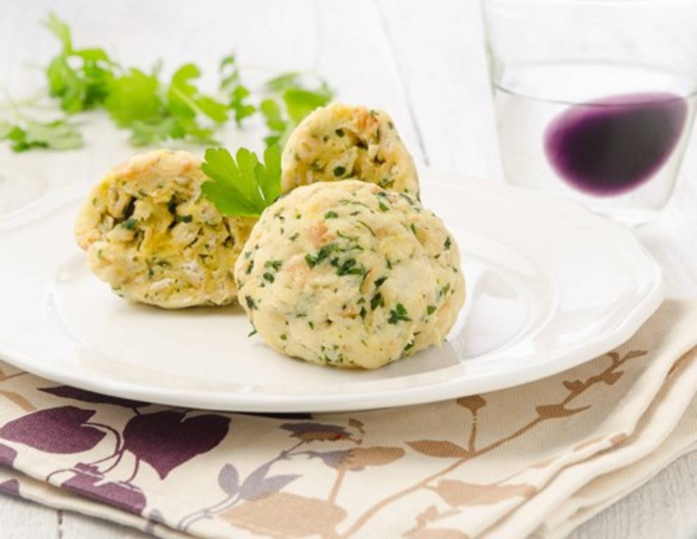 - Die Zwiebel in Butter anschwitzen, mit der Petersilie vermengen und mit den Semmelwürfeln vermischen. Die Hände anfeuchten und aus der Masse Knödel formen.