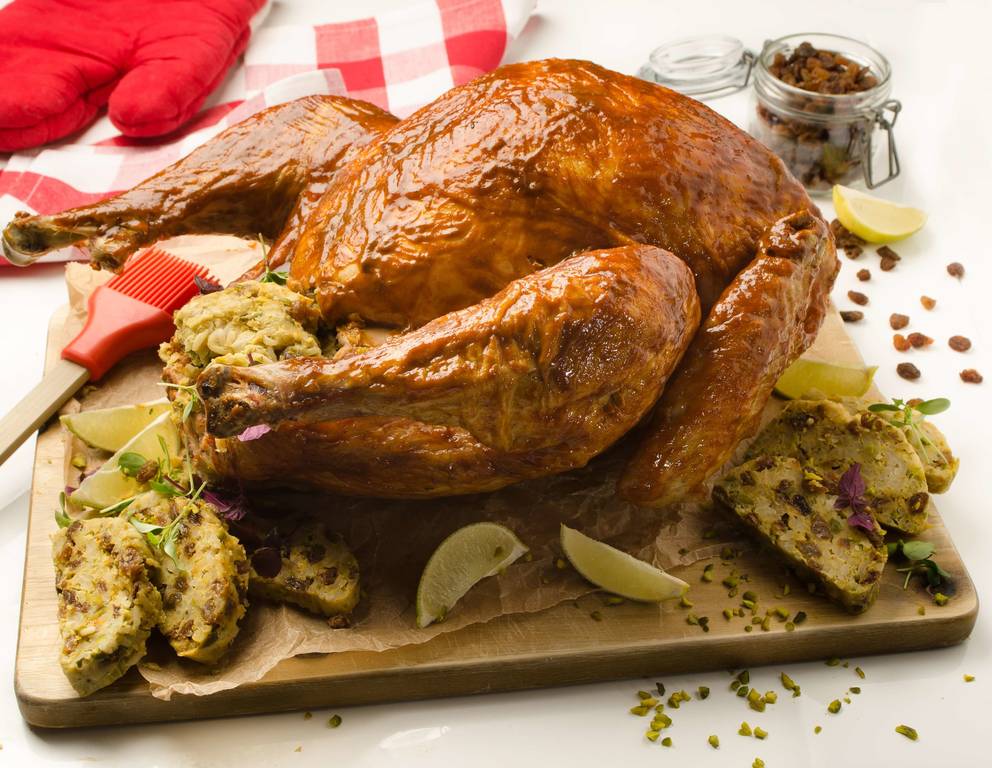 - Nach Möglichkeit ein Fleischthermometer verwenden. Der Truthahn sollte eine Kerntemperatur von 80 °C haben und rundherum braun sein. Die Bratdauer beträgt ungefähr 15 Minuten pro halbem Kilo Gewicht (ohne Füllung ein klein bisschen kürzer).