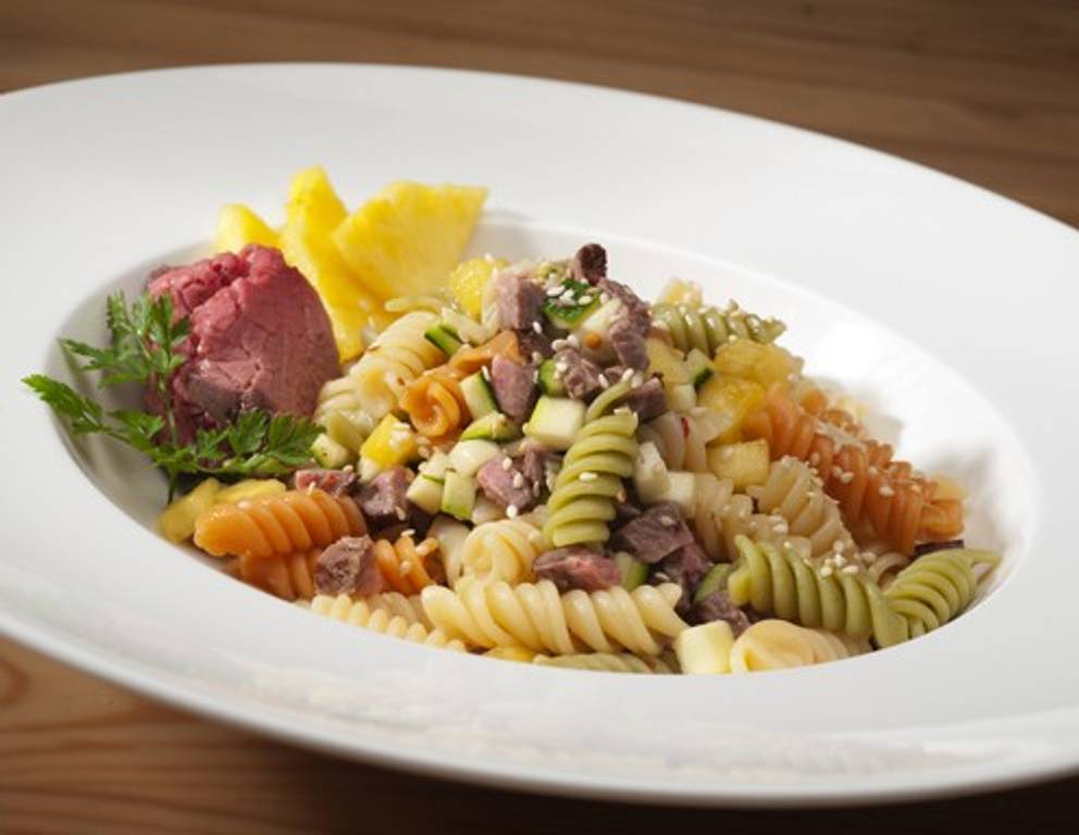 Vegetarier lassen bei dem Nudelsalat mit Ananas und Roastbeef das Fleisch einfach weg und ersetzen es durch Grillkäse.