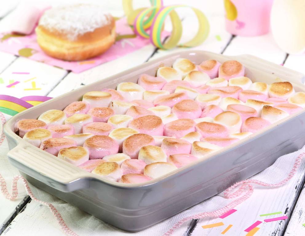 - Die Marshmallows sehr eng auf dem heißen Auflauf nebeneinander schlichten. Die Form nochmals ins Backrohr stellen und bei starker Oberhitze (Grillfunktion) für weitere 3-5 Minuten überbacken, bis die Marshmallows an der Oberfläche goldig braun sind.