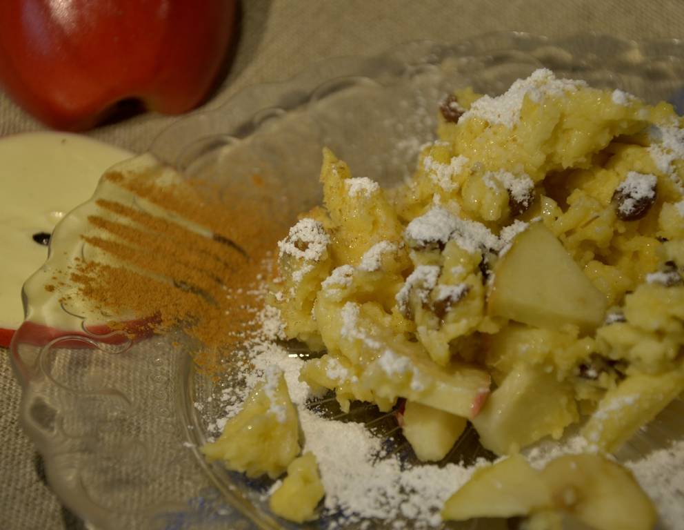 - Äpfel von der Schale befreien, vierteln, entkernen, in ganz feine Scheiben schneiden und unter den Teig vermengen. Fett in einer Bratpfanne zerlaufen, auf 2 oder evtl. Automatik-Kochplatte 7-9 goldgelbe Palatschinken backen, mit 2 Gabeln in Stücke reissen, noch mal ein klein bisschen Fett und 1 Tl. Zucker in die Bratpfanne geben, den Apfelschmarren unter durchgehendem Wenden goldbraun und kross backen. Mit Staubzucker bestäubt zu Tisch bringen.
