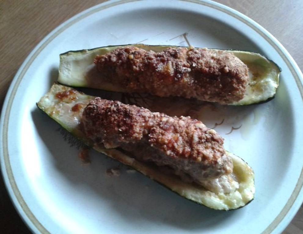 - Die Masse mit Faschiertem in einen Spritzbeutel geben und die Zucchini damit füllen.