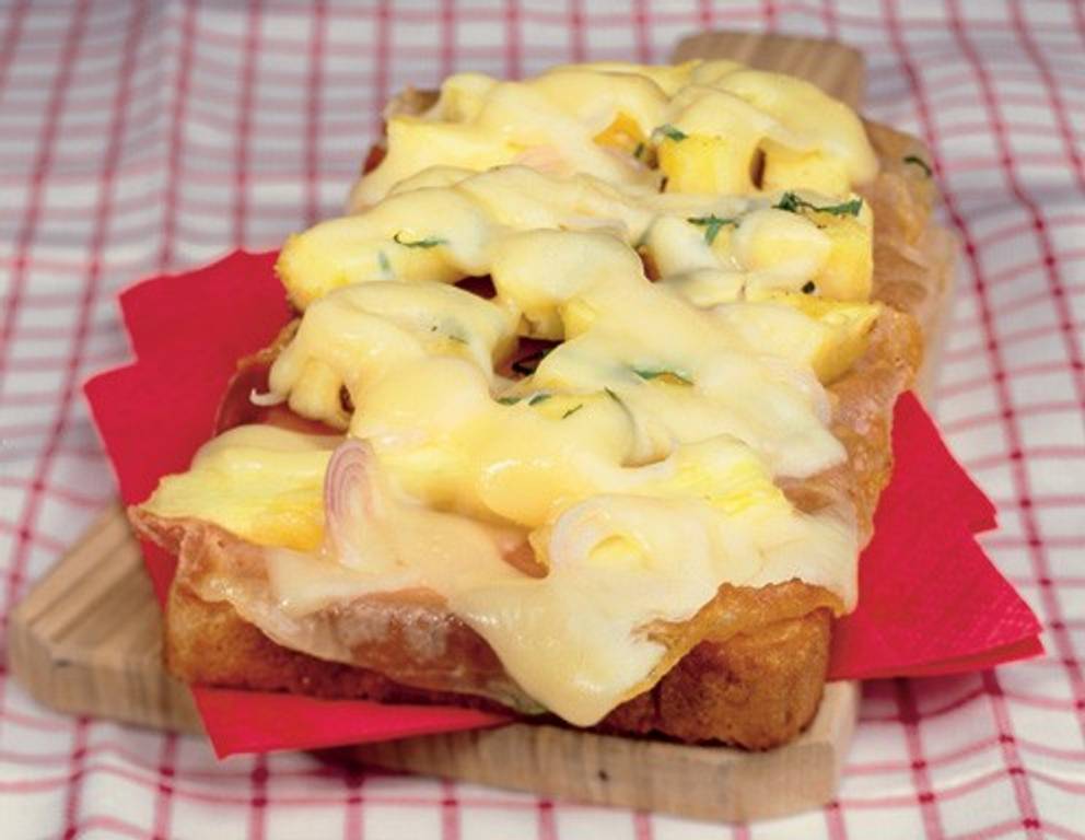 Für den Klassiker wird statt der Ananaswürfel eine ganze Scheibe Dosenananas verwendet und in die nach dem Gratinieren entstandene Käsemulde eine Cocktailkirsche gelegt. Noch besser schmeckt der Toast Hawaii mit einer, zuvor mit etwas Zucker karamellisierten, frischen Ananasscheibe. Statt Gouda kann man auch Emmentaler zum Überbacken verwenden.