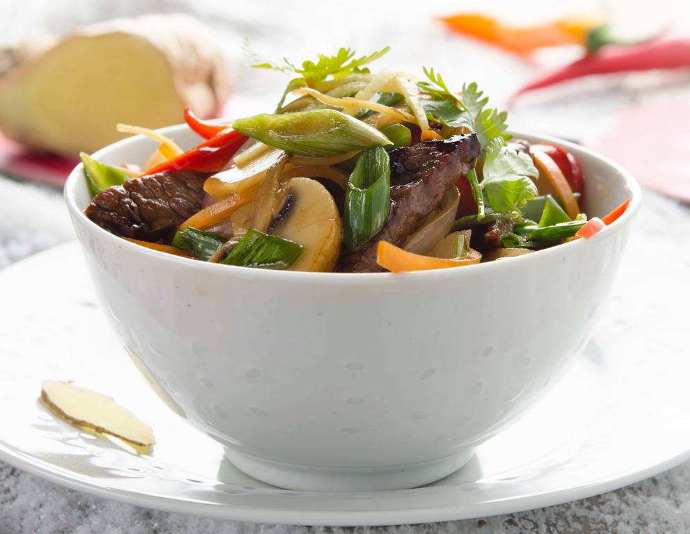 - Die Maisstärke mit dem Wasser glattrühren und unter das Gemüse mengen, wiederholt aufwallen lassen, bis die Sauce eindickt. Das Gemüse herausnehmen und warmstellen.