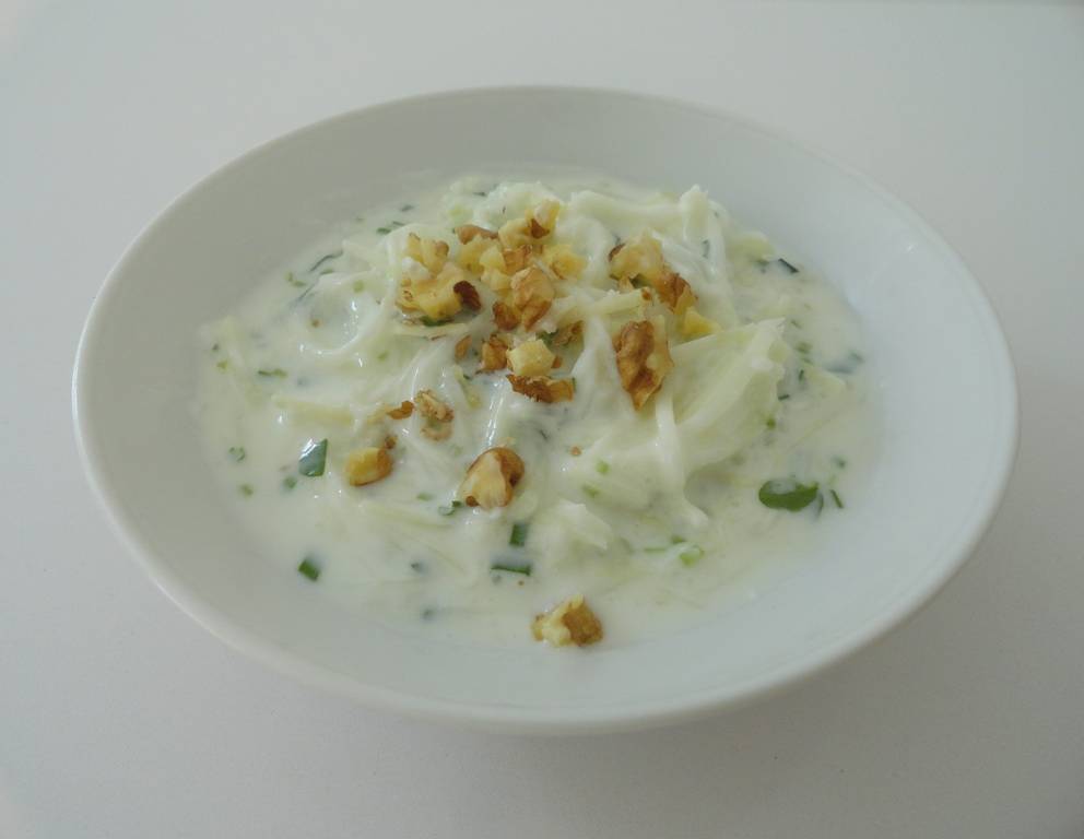 - Vinaigrette und Joghurt durchrühren, mit Zucker (2), restlichem Saft einer Zitrone, Salz und Pfeffer würzen. Selleriegrün hacken und unterziehen. Walnüsse grob hacken, unter den Blattsalat vermengen. Blattsalat mit Kohlrabigrün dekorieren und zu Tisch bringen.
