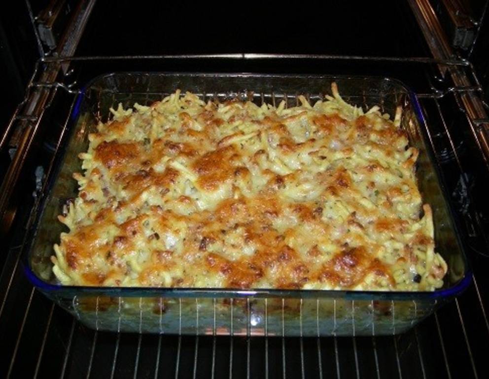 - Mit einem Schaumlöffel herausnehmen und mit dem Käse lagenweise in eine geeignete feuerfeste Form schichten. Schlagobers bis auf 3 EL darübergießen.