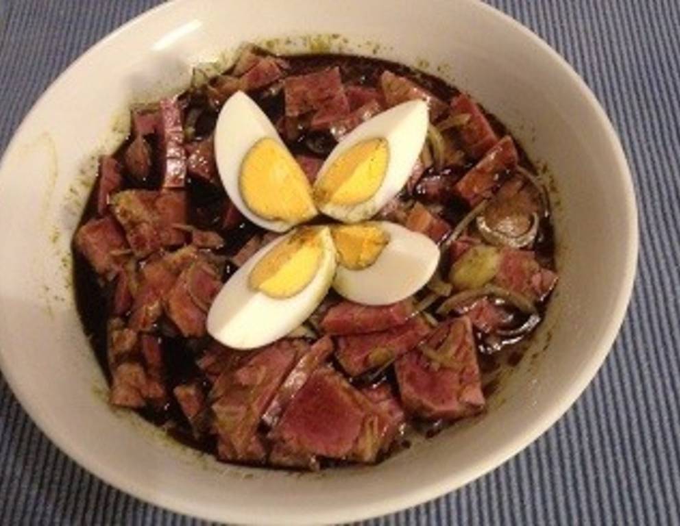- Einen Tag später die erstarrte Fettschicht entfernen, die Metallschüssel kurz in warmes Wasser stellen und stürzen. Die Sulz vom Kalbskopf in etwa 1 cm dicke Scheiben schneiden und mit Kernöl und Zwiebelringen garnieren.