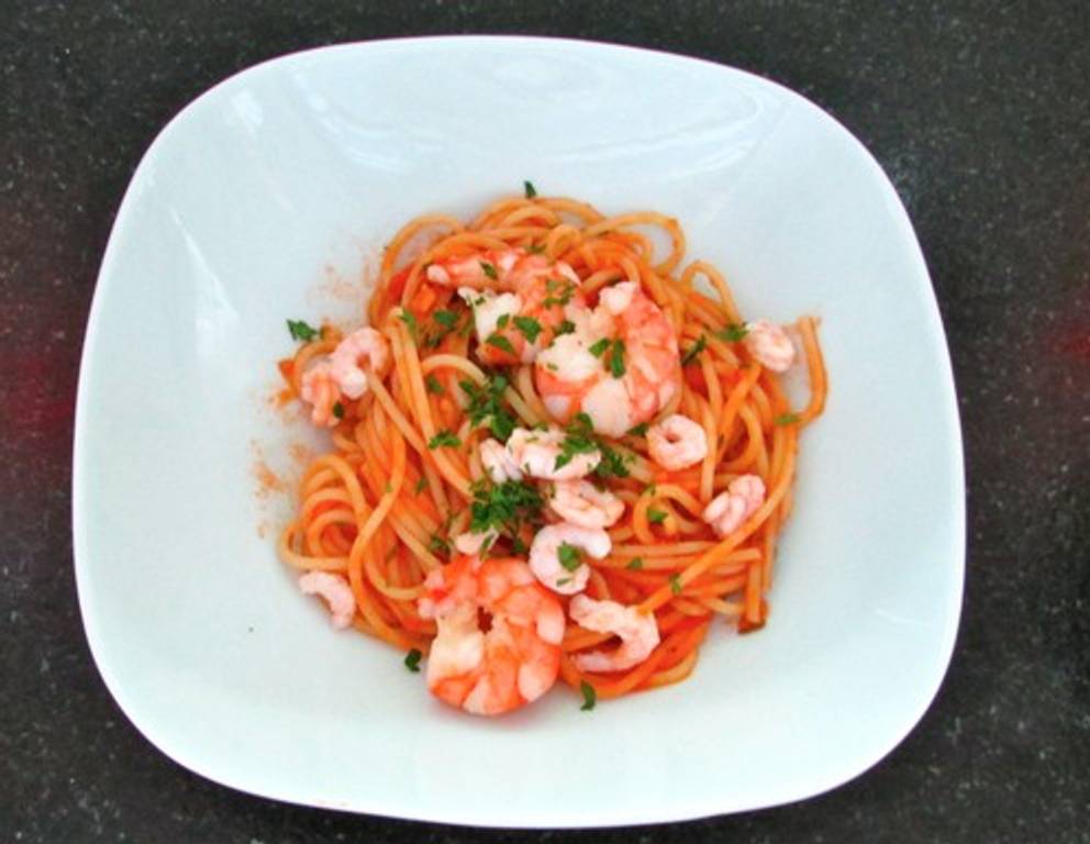 - Für die Spaghetti mit Garnelen die Schrimps im heißen Öl schnell ein paar Minunten rösten, herausnehmen und ein wenig auskühlen lassen.
