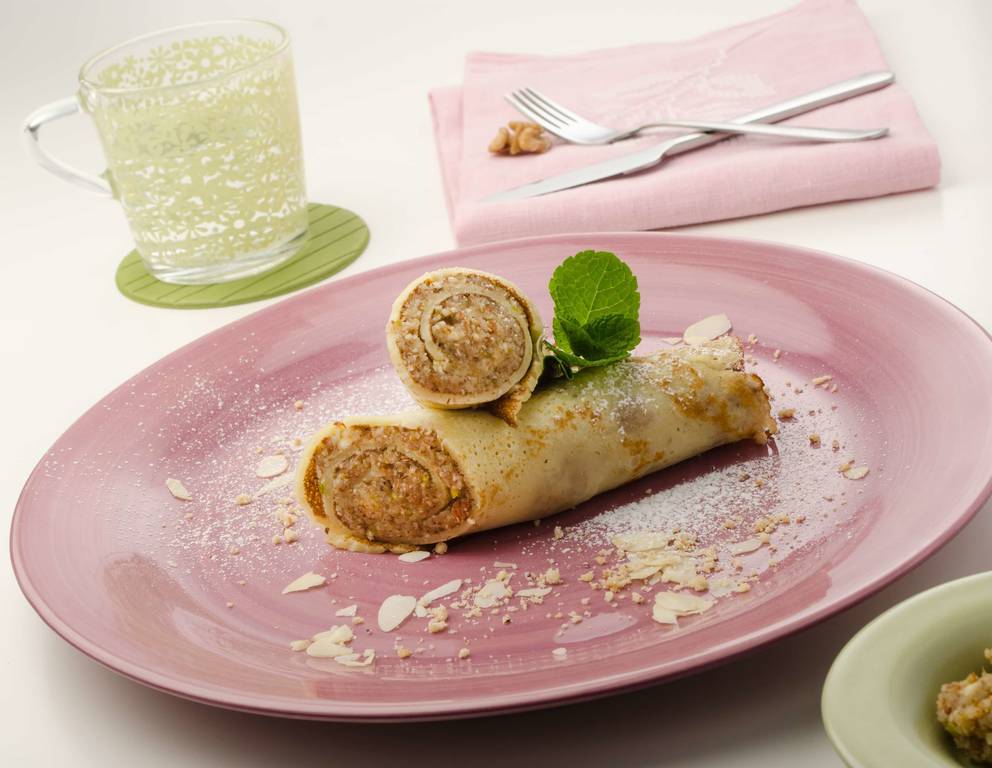 - Nun die Palatschinken mit der Nussfülle bestreichen und einrollen.