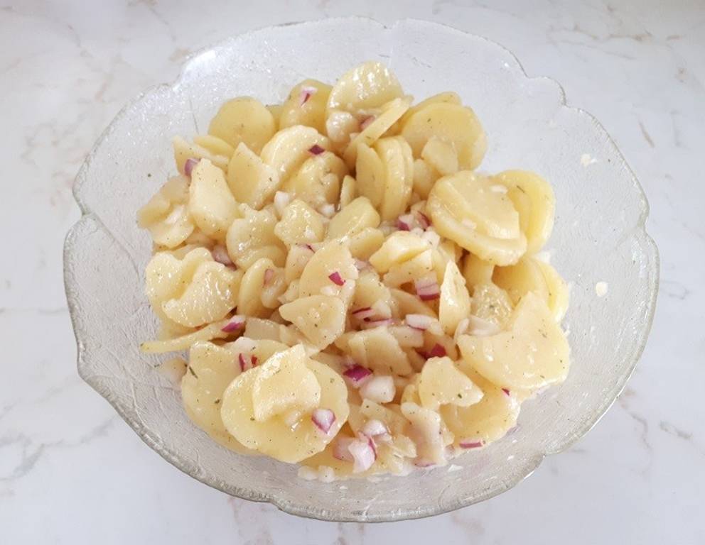 - Die Erdäpfeln werden in der Schale gargekocht, sodann heiß abgeschält, wonach man sie ein wenig auskühlen lässt. Ideal ist es, wenn man am Vortag gekochte Erdäpfeln verwendet. Die Zwiebel kleinschneiden und in eine Schüssel geben, darüber schnitzelt man die Erdäpfeln in mundgerechte Scheibchen. Nach jeder zweiten Erdapfel erst einmal ein wenig Öl, dann ein wenig Essig darübergeben. Nach der letzten Erdapfel - neben Essig und Öl mit ein wenig Salz die Erdäpfeln würzen und alles zusammen vorsichtig mit einem Salatbesteck mischen. Danach muss der Blattsalat zirka 2 Min. ziehen. Zum Schluss die kochende klare Suppe über die Erdäpfeln gießen und vorsichtig unterziehen, bis der Blattsalat die Konsistenz hat, die Sie gerne mögen. Er sollte schön fest bleiben. Den Blattsalat wiederholt mit ein wenig Essig und Öl und selbstverständlich mit Salz nachwürzen.