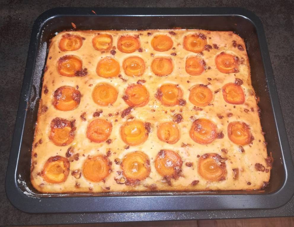 - Den Marillen-Topfen-Kuchen bei 200 °C Unterhitze auf zweiter Schiene im Backrohr ungefähr 35-40 Minuten lang backen. Auskühlen lassen.