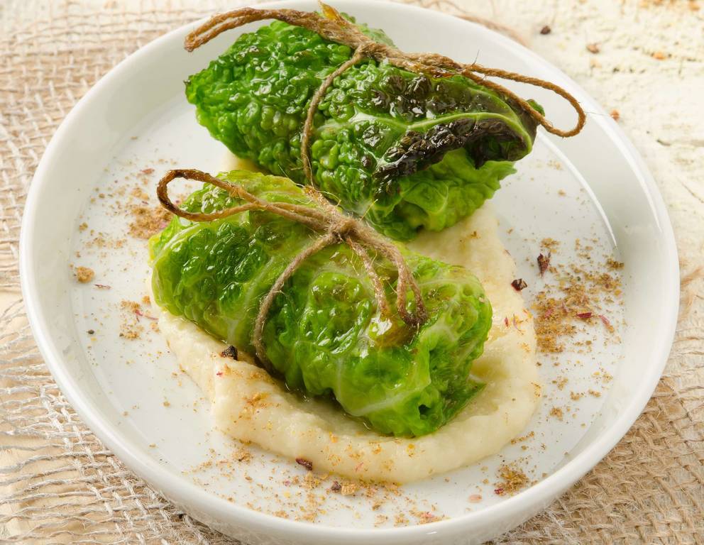 - Von den Kohlblättern jeweils das untere Ende des dicken Strunks dreieckig ausschneiden und die Blätter in kochendem Salzwasser blanchieren. Nach ca. 2 Minuten in Eiswasser abschrecken. Übrigen Kohl klein hacken.
