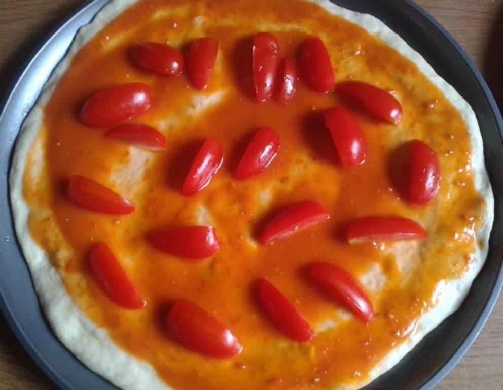 - Für die Pizza mit Cherrytomaten und Basilikum zunächst den Pizzateig zubereiten. Den gegangenen Pizzateig zu 2 Fladen auswalken, dabei einen 1 cm hohen Rand formen.