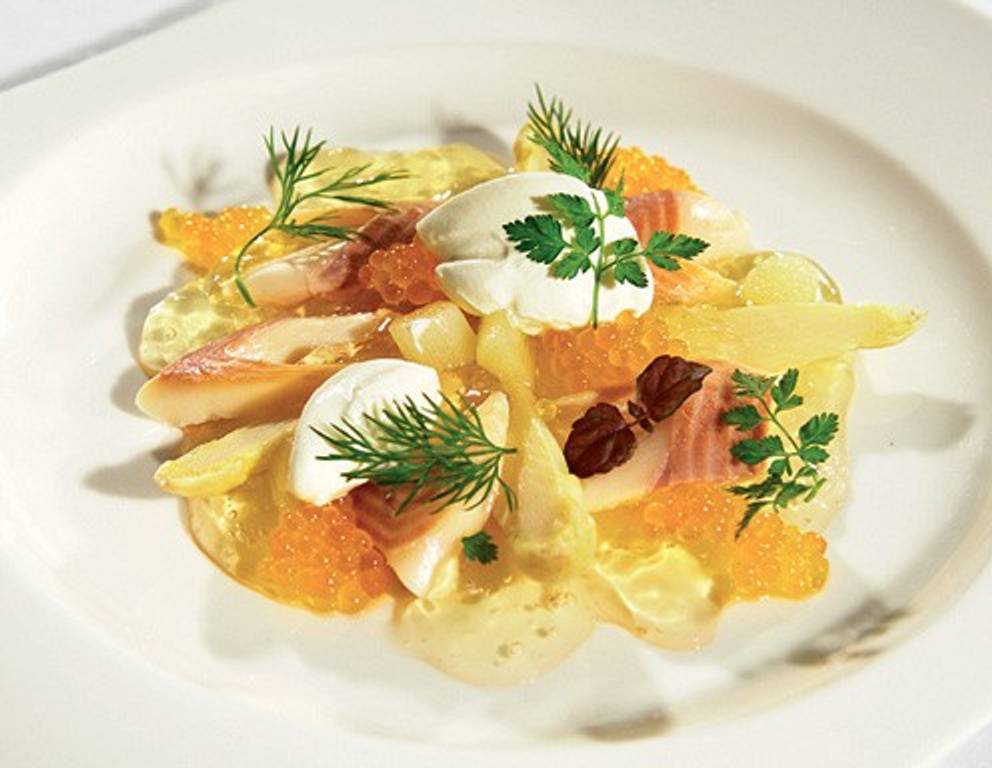 - Die Tomaten salzen, mixen, Masse in ein Küchentuch einschlagen und so aufhängen, dass der Saft über einer Schüssel abtropfen kann. Etwa 1 Stunde abtropfen lassen. Spargel schälen, holzigen Teil wegschneiden und in Salz-Essig-Wasser bissfest kochen. Herausnehmen und abkühlen lassen. Forellenfilets enthäuten und Haut mit dem klaren Tomatensaft, Mineralwasser, Sternanis, Pfefferkörnern, Schalotten, Lorbeerblatt und etwas Sherry-Essig einmal aufkochen. Etwa 10 Minuten ziehen lassen. Inzwischen Gelatine in kaltem Wasser einweichen und ausdrücken. Tomatenfond abseihen (es sollten jetzt etwa 400 ml sein) und Gelatine darin auflösen. Fond in einem Eiswürfelbad bis kurz vor dem Gelieren abkühlen, dabei gelegentlich umrühren. Vorgekühlte tiefe Teller mit ca. 2 Esslöffeln gelierendem Tomatenfond benetzen. Forellenfilets in kleinere Stücke zerteilen, einlegen und wieder mit Fond überziehen. Solospargel in kleine Scheiben schneiden, auflegen und wieder mit Fond begießen. Etwa 20 Minuten kalt stellen. Währenddessen die gezupften Kräuter mit etwas Traubenkernöl und Sherry-Essig marinieren. Auf der gekühlten Sulz anrichten, mit einem Tupfen Joghurt und Kaviar garnieren.
