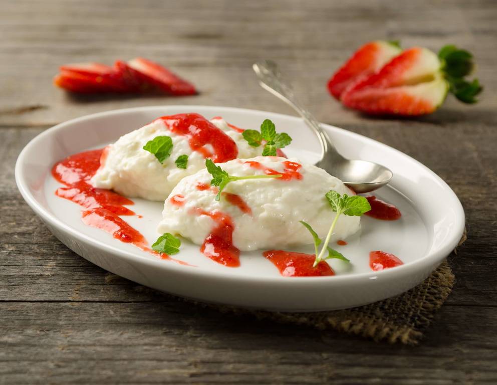 - Das Joghurt-Mousse mit Erdbeeren anrichten und mit Minzeblättchen garnieren.