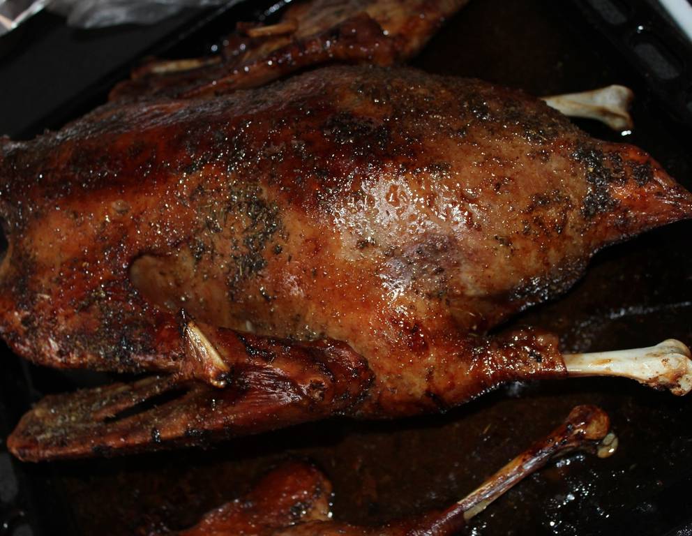 - Das Olivenöl in einen großen Bräter geben, die Ente mit den Rücken nach oben einfüllen. In den heißen Herd schieben 40 Minuten rösten. Mehrmals mit Bratensaft begießen.