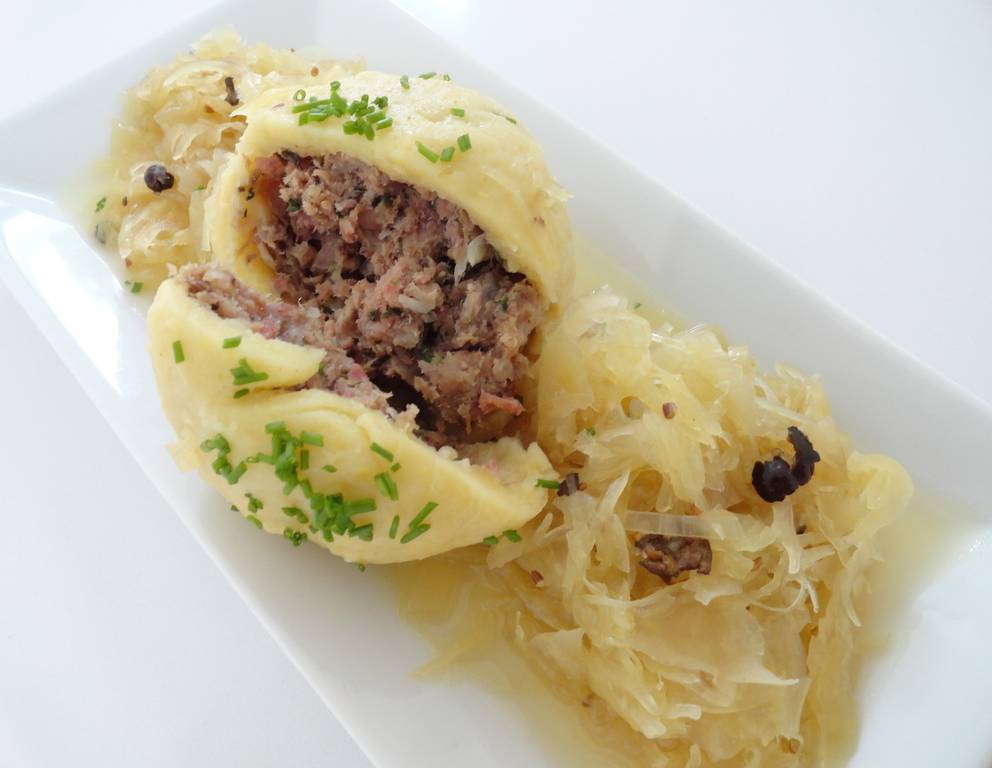 Die Hascheeknödel mit Sauerkraut kann man auch mit fertigem Faschierten machen.