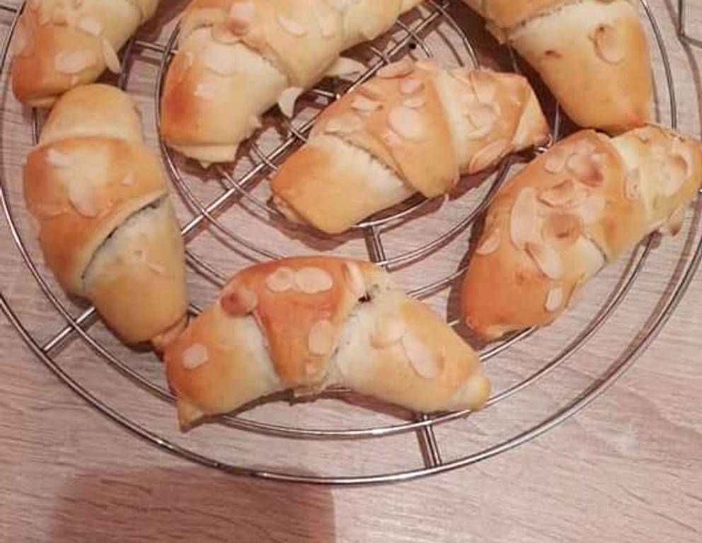- Daraus werden kleine Hörnchen geformt, die man auf dem dürftig eingefettetem Backblech im heissen Rohre bäckt.