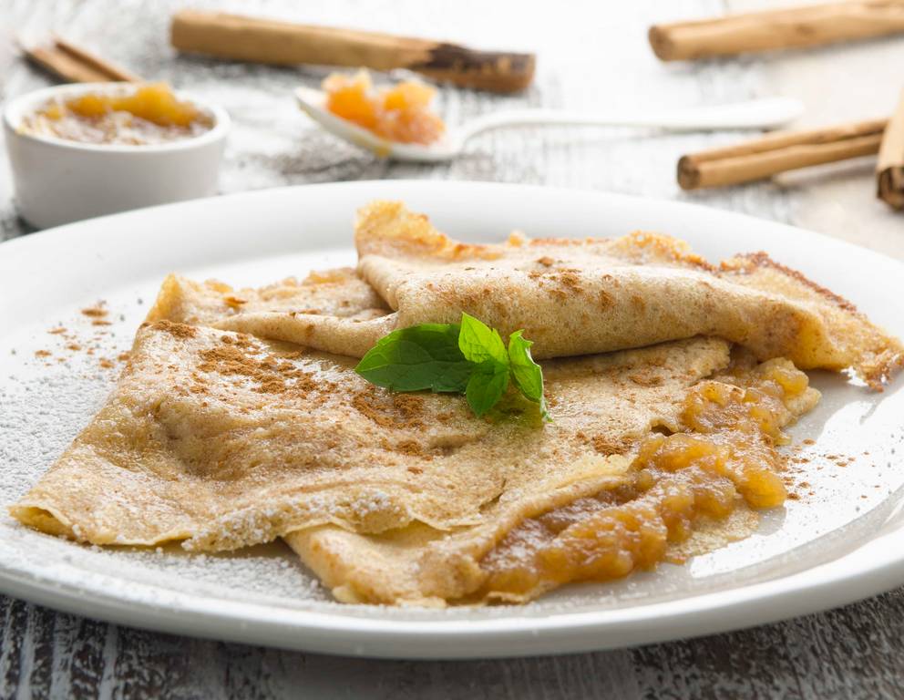 Die Zimt-Crêpes mit Karamell-Äpfeln schmecken auch mit einer Kugel Vanilleeis oder einem Tupfer Schlagobers.