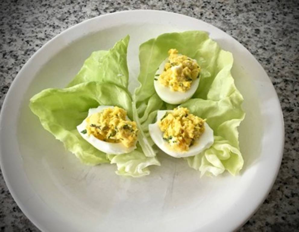Anstatt in gekochte Eierhälften könne Sie die Füllung auch mit einem TL zurück in die heiß ausgespülten Eierschalen füllen.