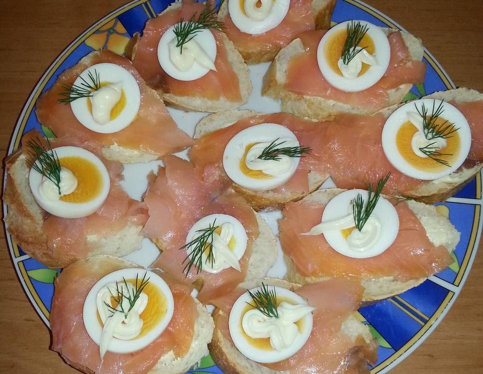 - Sauce auf Vollkornbrot-Scheibchen aufstreichen, Räucherlachs in Scheibchen darauf gleichmäßig verteilen und je mit ein paar Klecksen Crème fraîche zu Tisch bringen. Nach Lust und Laune mit Dill garnieren.