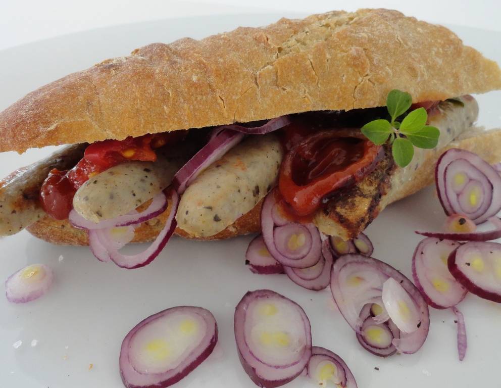 - Für das Bratwurstsandwich das Backrohr vorheizen und den Grill mit Alufolie zudecken. Die Bratwürste darauflegen und in etwa 20 Minuten grillen.