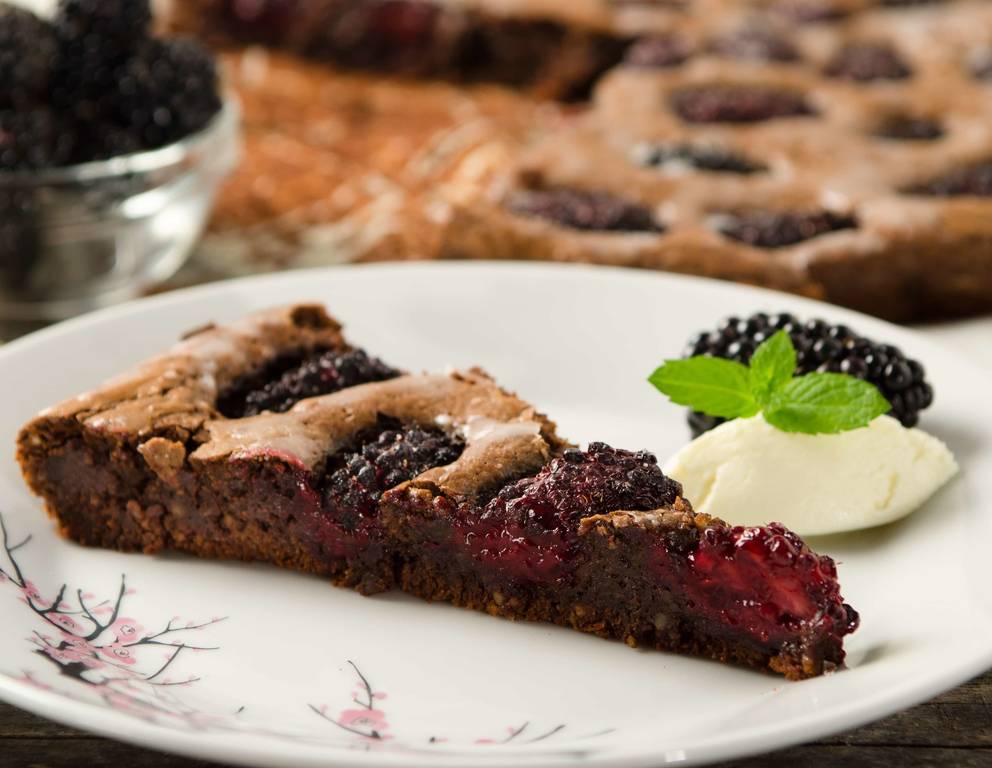 - In Portionsstücke teilen und mit frischen Brombeeren, Obers und Minzeblättchen garnieren.