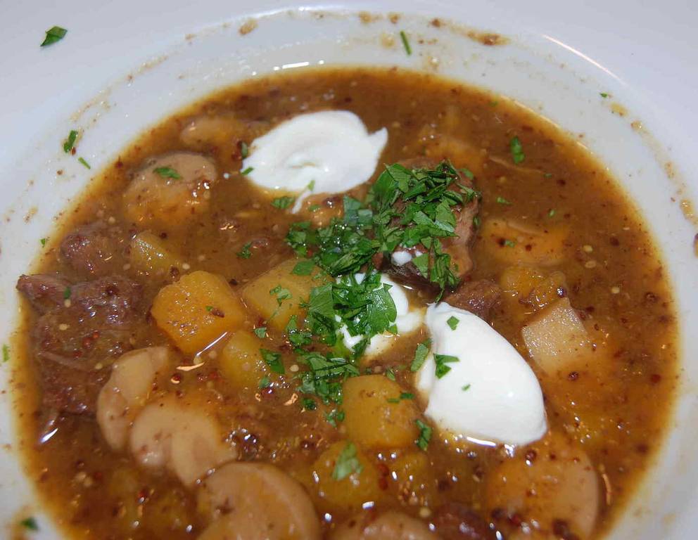 - Salzen, mit Pfeffer würzen, bei geschlossenem Deckel zirka 90 Minunten schmoren. 30 Minuten vor Ende der Garzeit Kürbiswürfel und Schwammerln zufugen.