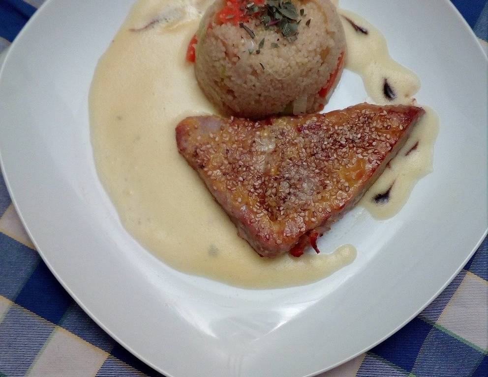 Gebratener Thunfisch mit Vanillesabayon schmeckt auch mit köstlich. Wer möchte, gibt noch frische Petersilie darüber.