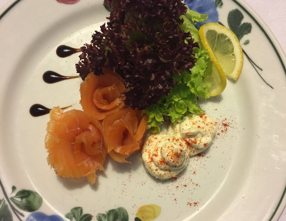 - Den Lachs zu Röschen formen und auf dem Blattsalat ausrichten. Mit gelben und orangfarbenen Kapuzinerkresseblüten garnieren.