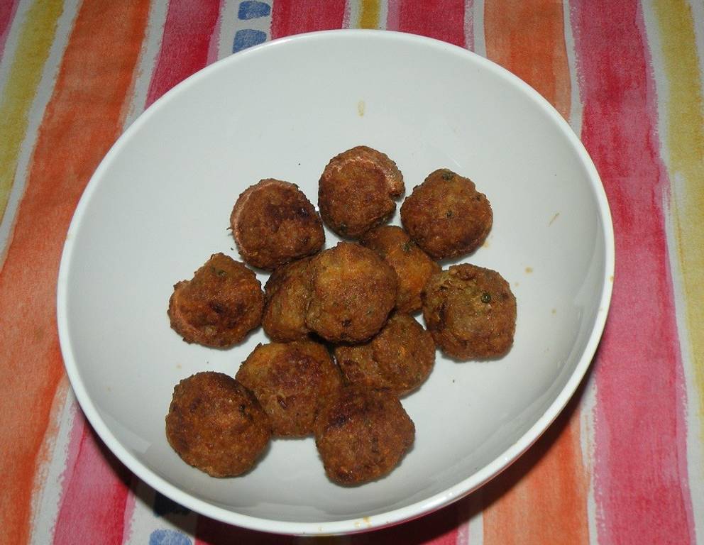 - Aus dem Teig 30 pflaumengrosse Bällchen formen. In der Zwischenzeit Öl in einer Friteuse erhitzen. Fleischbällchen portionsweise im Öl fünf min kross zu Ende backen. Die fertigen Bällchen herausnehemen und auf das Küchenrolle legen. Heiss oder evtl. abgekühlt als Zuspeise zur Reistafel ser- vieren. Dazu scharfe Paradeisersauce und Krabbenbrot (Krupuk) anbieten.