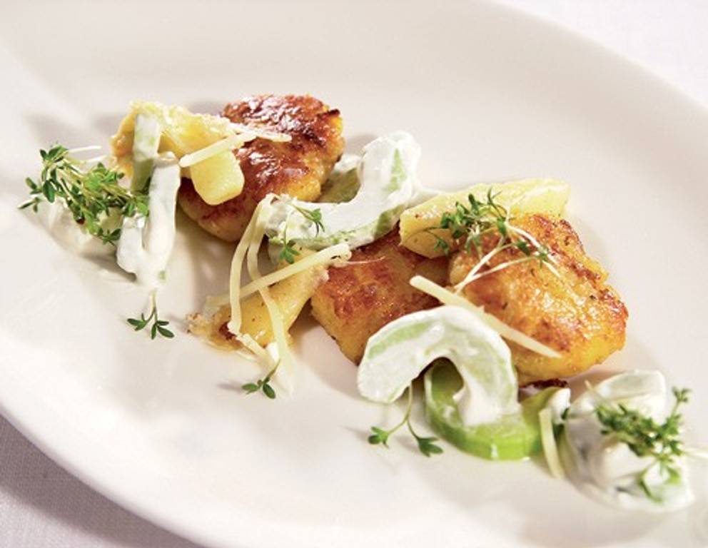 - Mit Salz, Pfeffer und Muskatnuss würzen. Mit leicht angefeuchteten Händen aus der Masse Knödel oder Laibchen formen.