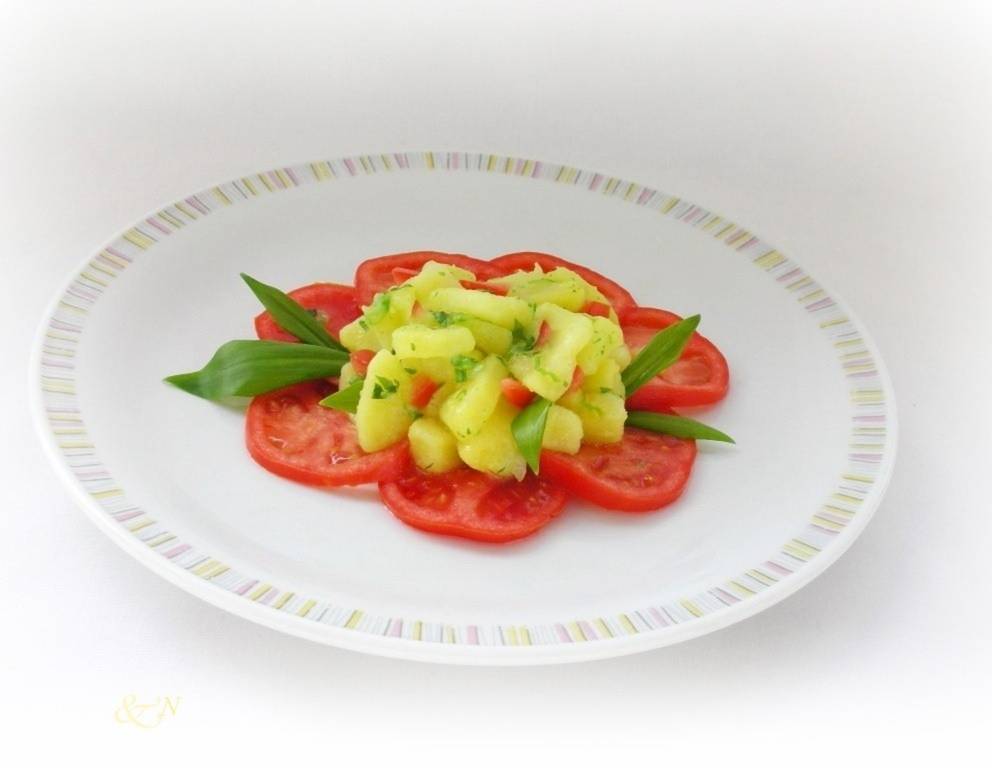 - Paradeiser vierteln, entkernen und würfeln. Würfel gemeinsam mit dem Pesto unter den Kartoffelsalat heben.