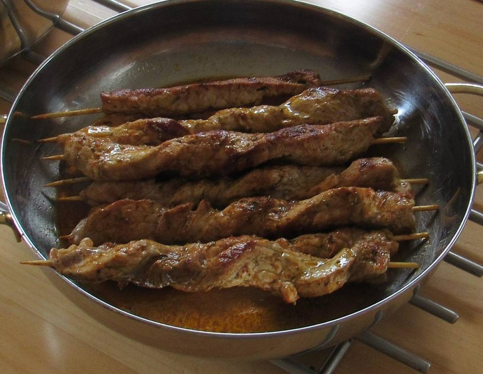 - Danach das Fleisch in Zickzackform auf die in Wasser eingeweichten Holzspieße fädeln und auf heißem, ausgeglühtem Feuer von jeder Seite ca. 3-5 Minuten grillen.