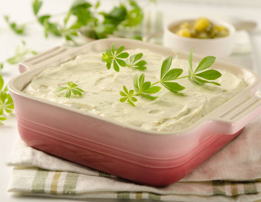- Die Waldmeistercreme auf dem vorbereiteten Boden in der Auflaufform verteilen und glatt streichen. Vor dem Servieren im Kühlschrank ca. 2-3 Stunden durchkühlen lassen. Mit frischen Waldmeisterzweigen garnieren.